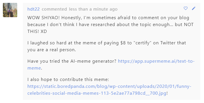 – Comment 1 of mine is on Shiyao GO WILD post on MEMEs about Social media. Love it!
